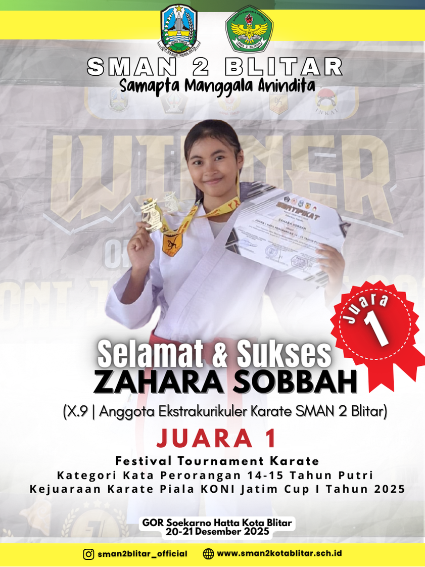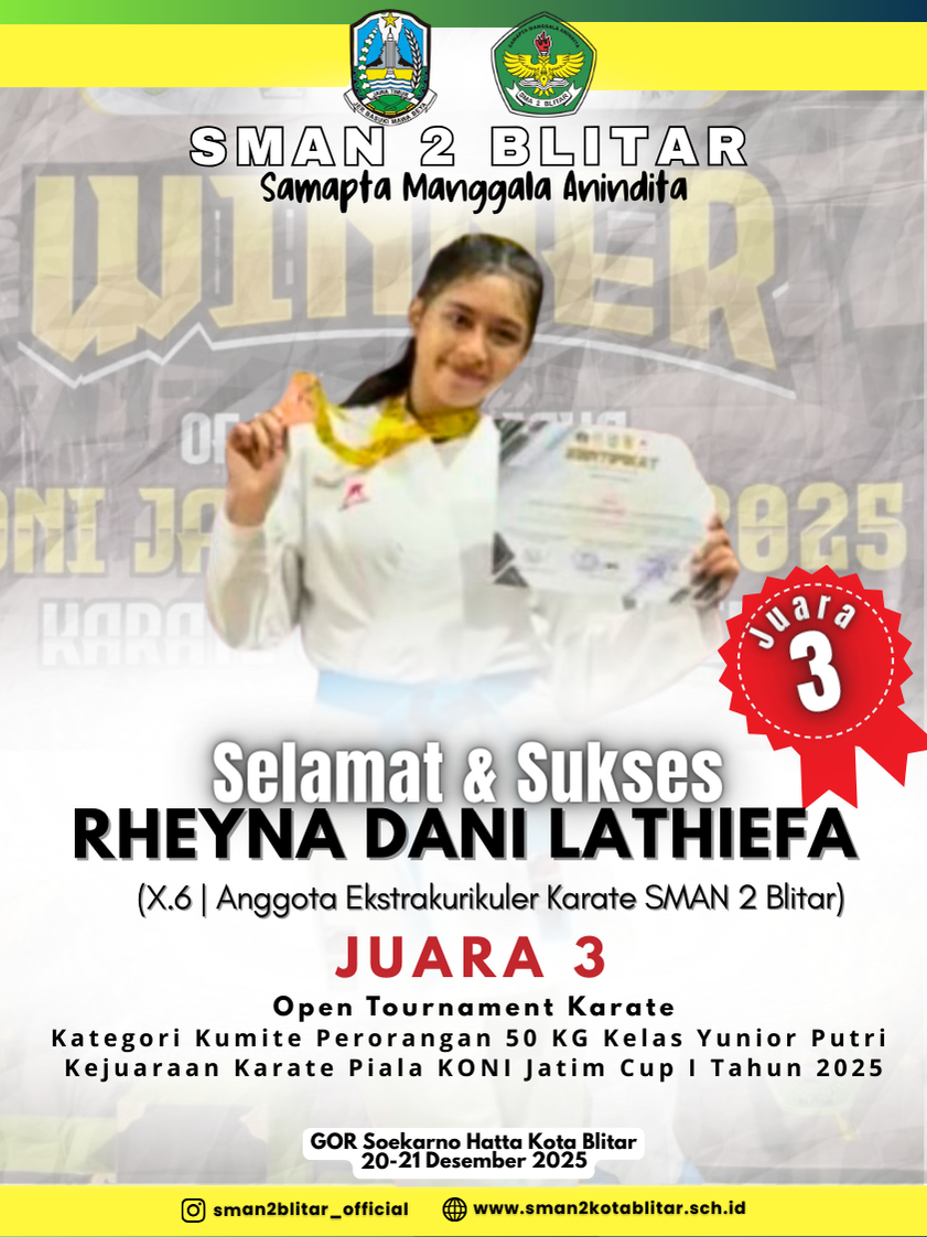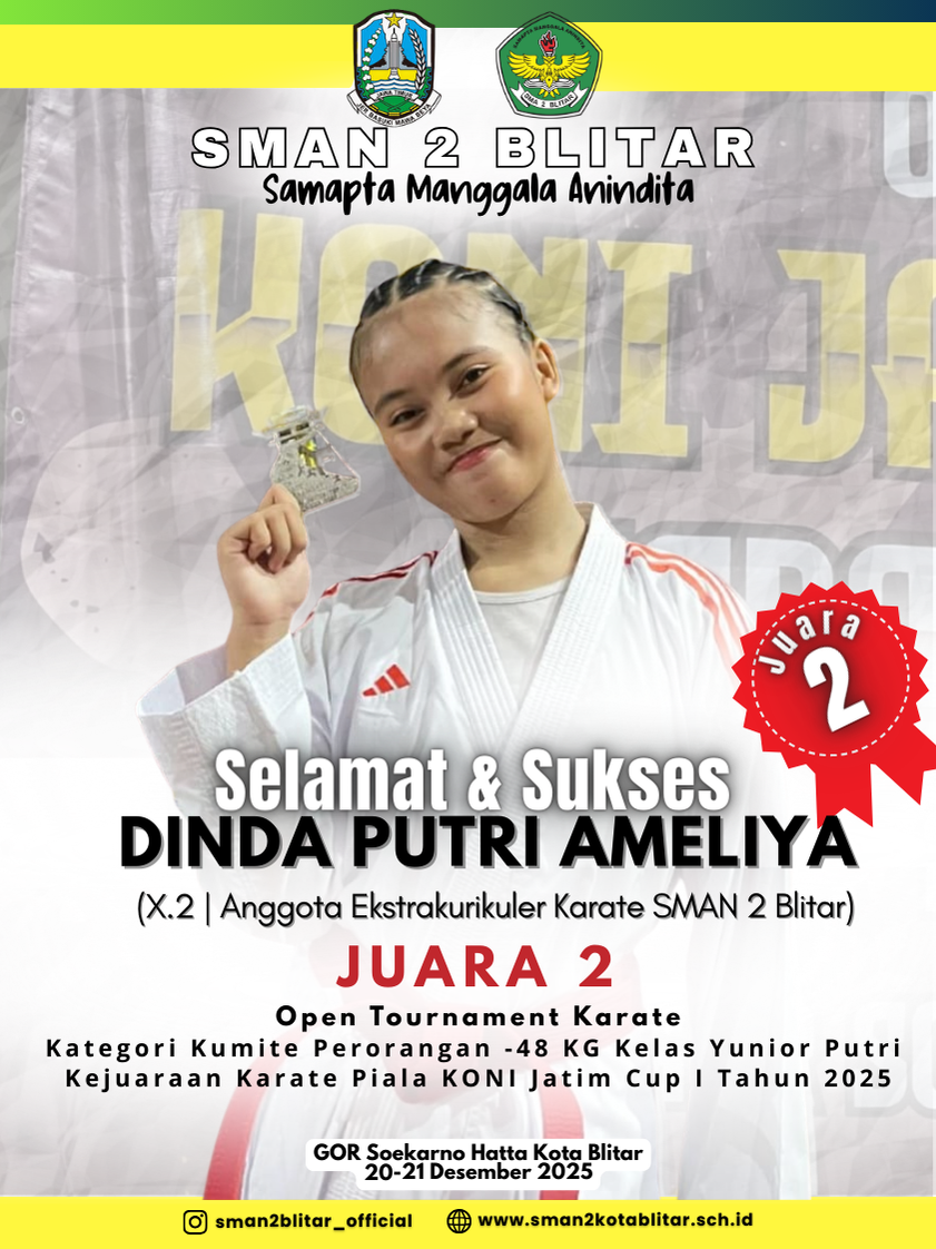 Ekstrakurikuler Karate SMAN 2 Blitar kembali menorehkan prestasi membanggakan dalam ajang Kejuaraan Karate Piala KONI Jatim Cup 1 Tahun 2025. Kejuaraan tersebut dilaksanakan pada 20–21 Desember 2025 bertempat di GOR Soekarno Hatta Kota Blitar, dan diikuti oleh atlet-atlet karate dari berbagai daerah.